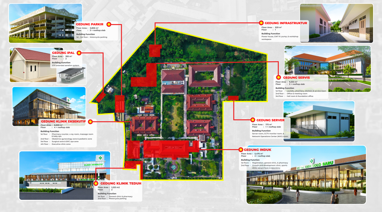 Healthcare Dr. OEN Solo Baru Hospital Company Yayasan Kesehatan Panti Kosala Location Central Java Project Completion 2027 Floor Area Total 27.903 m2 Floors up to 4 floors each Land Area 112.471 m2 Buildings 8 buildings